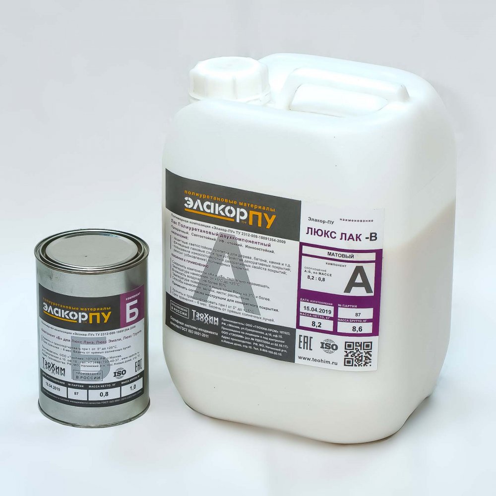 Люкс Лак-В Матовый (водный)"Элакор-ПУ Люкс Лак-В – двухкомпонентный полиуретановый матовый лак на водной основе. После отверждения: полностью прозрачный, светостойкий, УФ-стойкий; паропроницаемый; имеет высокую стойкость к истиранию. Назначение. - Финишны